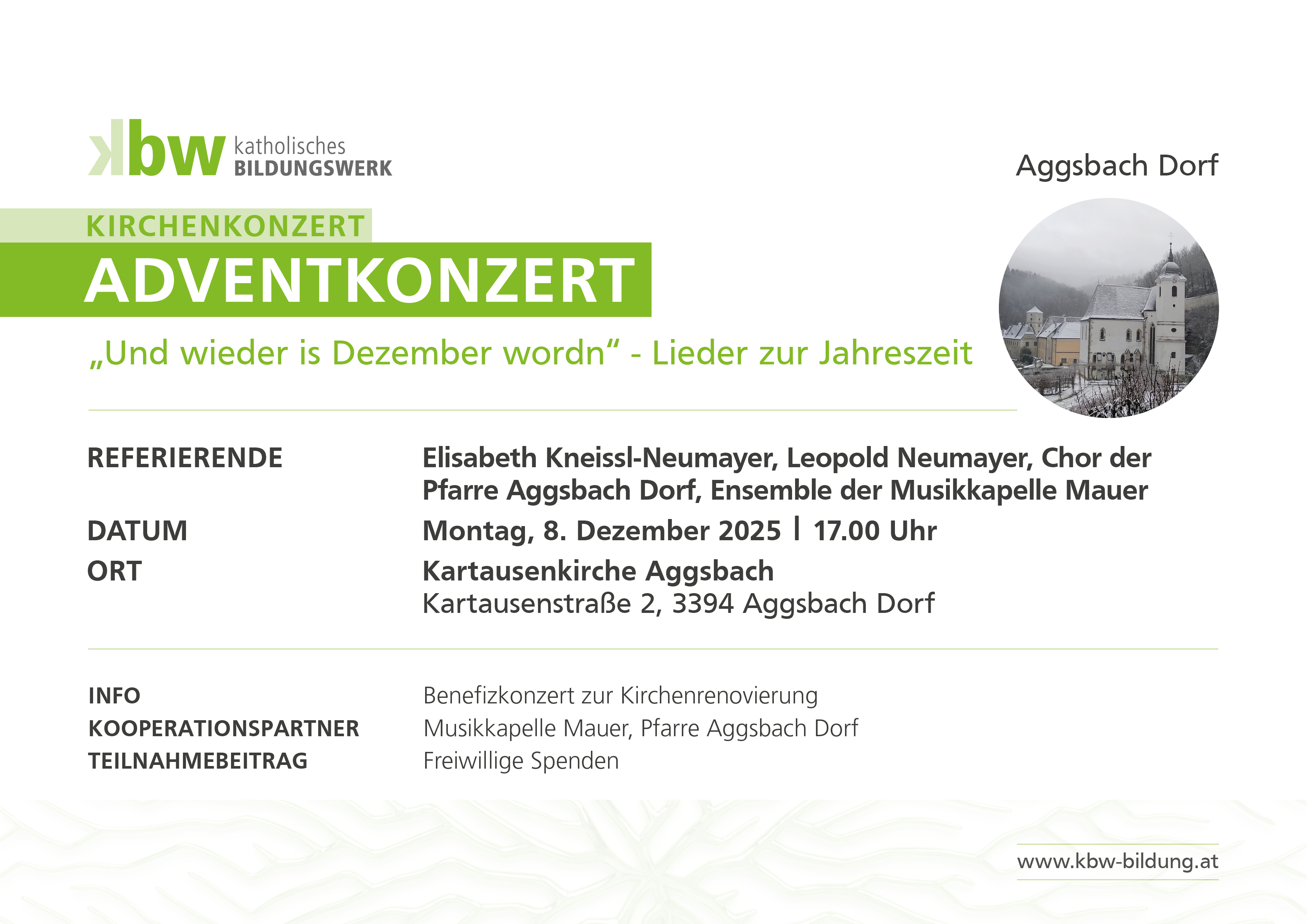 Katholisches Bildungswerk Aggsbach Dorf29. März 2025, 17.00 Uhr, Kartausenkirche: Marienkonzert im Duft der Wachauer Marillenblüte. Nina Adlon (Gesang), Alfred Nussbaumer (Orgel), Wilhelm Ziegler (Moderation). 28. August 2025: 17.00 Uhr - 19.00 Uhr, Lesung im Refektorium der ehm. Kartause Aggsbach, Michaela und Wilhelm Maria Lipp mit einem Programm für Jung und Alt. 29. August 2025: 19.00 Uhr, Orgelkonzert in der Kartausenkirche. Felix Deinhofer spielt Orgelmusik aus fünf Jahrhunderten ("Vom Barock bis zur Moderne"). 30. August 2025: 19.00 Uhr, Chorkonzert in der Kartausenkirche ("Abendstimmung"). CHORiosum, Ltg. Erna Mayrhofer. 4. Oktober 2025: 17.00 Uhr, Panflötenkonzert in der Kartausenkirche. 8. Dezember 2025, 17.00 Uhr, Kartausenkirche: Advenkonzert. |